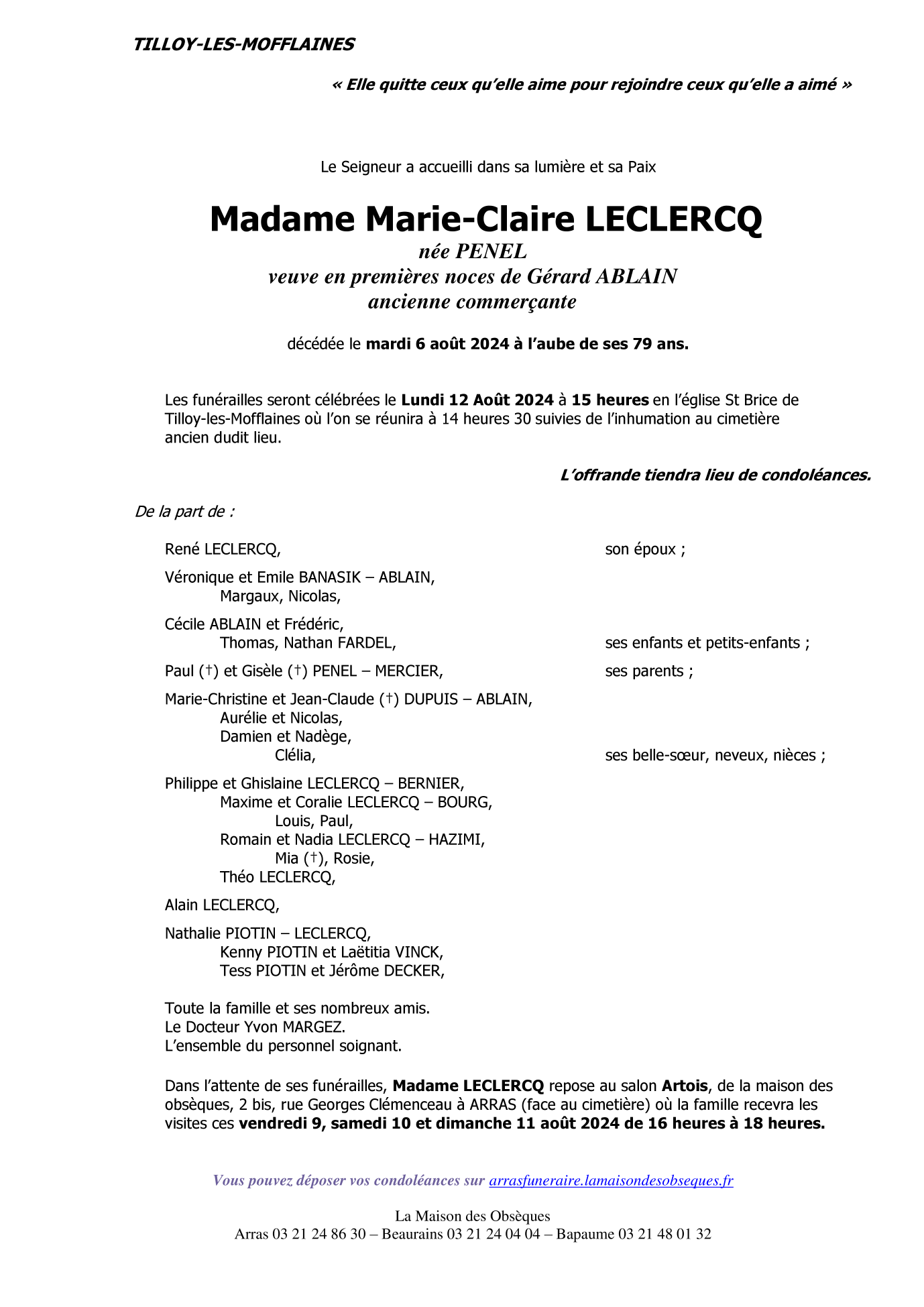 de Madame Marie-Claire LECLERCQ née PÉNEL