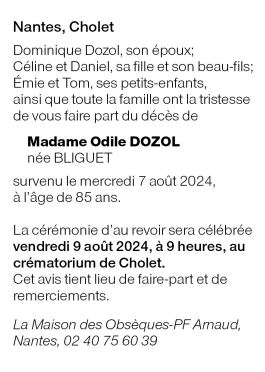 Cet espace « condoléances » est dédié à la mémoire de Madame Odile DOZOL née BLIGUET.