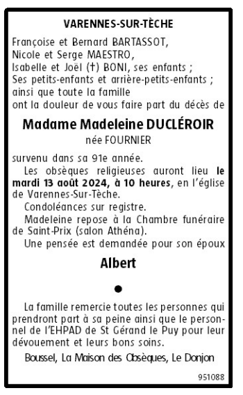 Cet espace « condoléances » est dédié à la mémoire de Madame Madeleine DUCLEROIR née FOURNIER.