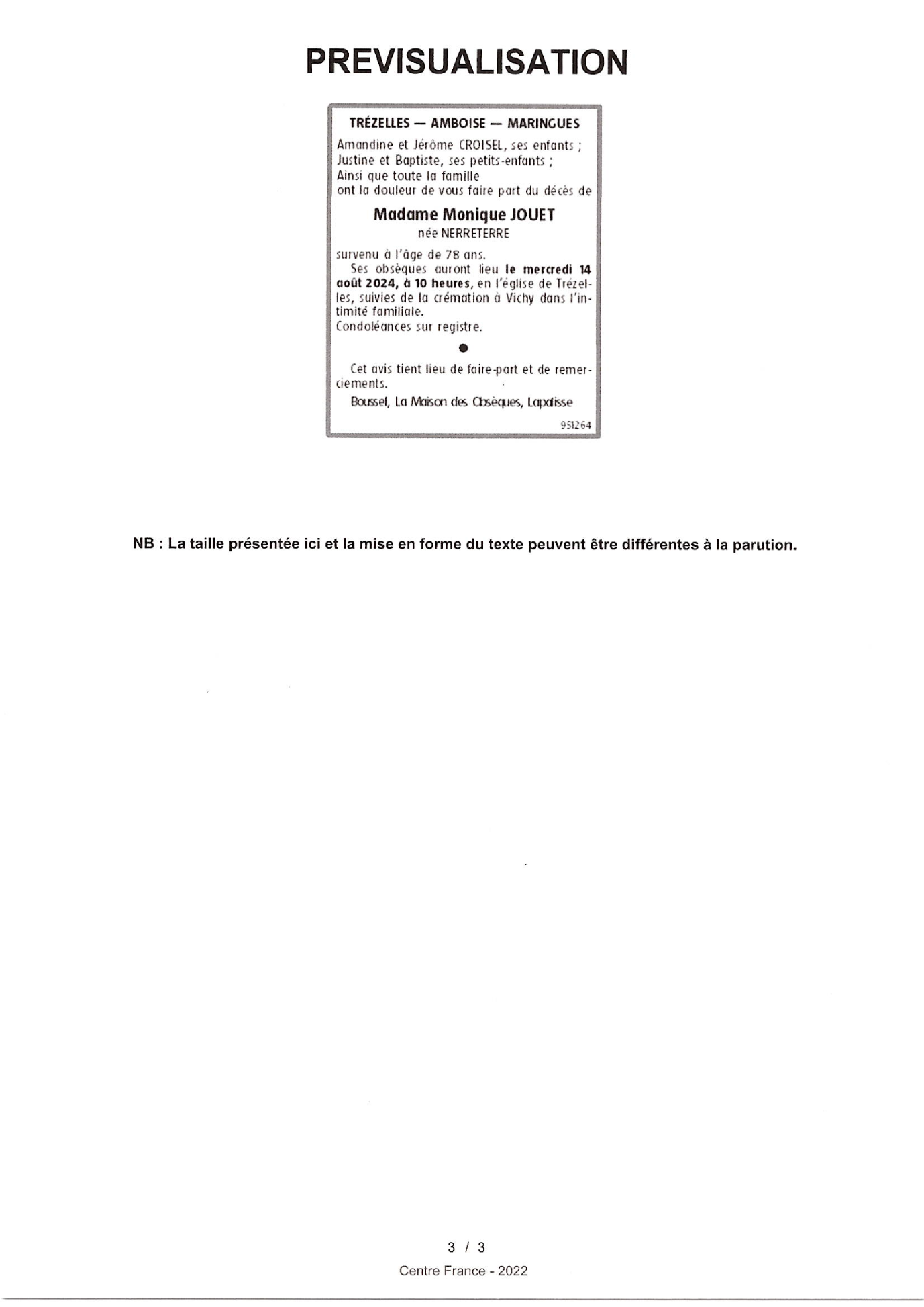 Cet espace « condoléances » est dédié à la mémoire de Madame Monique JOUET née NERRETERRE.