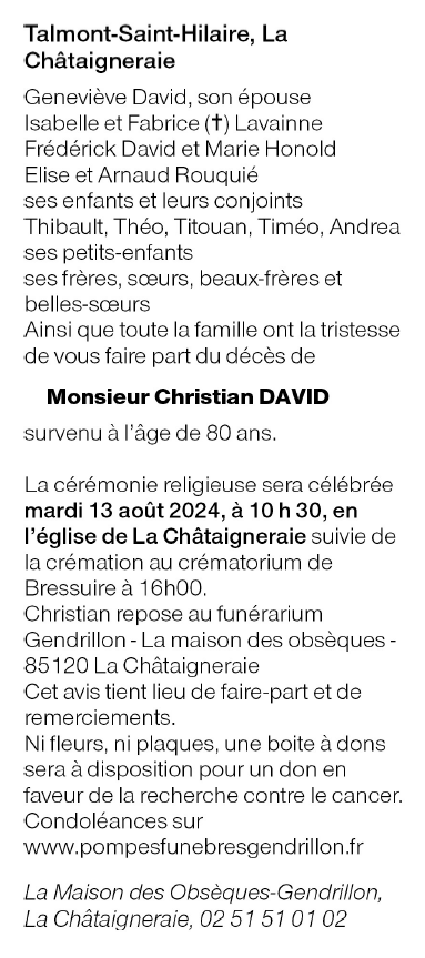 Cet espace « condoléances » est dédié à la mémoire de Monsieur Christian DAVID.