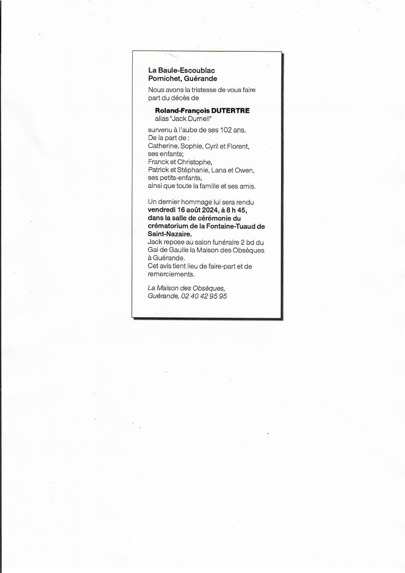 Cet espace « condoléances » est dédié à la mémoire de Monsieur Roland DUTERTRE.