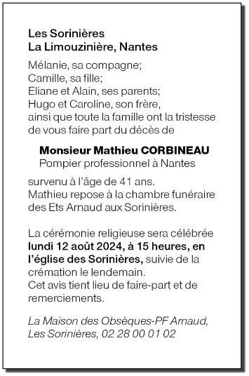 Cet espace « condoléances » est dédié à la mémoire de Monsieur Mathieu CORBINEAU.