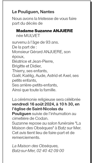 de Madame Suzanne ANJUERE née MULVET