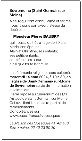 Cet espace « condoléances » est dédié à la mémoire de Monsieur Pierre BAUBRY.