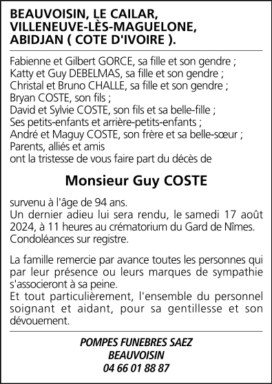 Cet espace « condoléances » est dédié à la mémoire de Monsieur Guy COSTE.