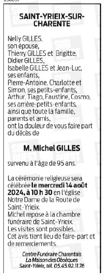 Décédé à Angoulême (16000) le jeudi 8 août 2024