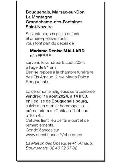 de Madame Denise MALLARD née FERRE
