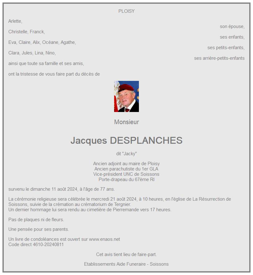 Cet espace « condoléances » est dédié à la mémoire de Monsieur Jacques DESPLANCHES.
