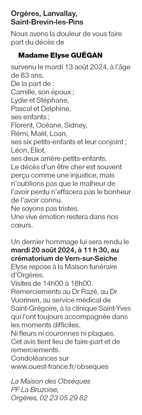Cet espace « condoléances » est dédié à la mémoire de Madame Elise GUÉGAN née LERAY.