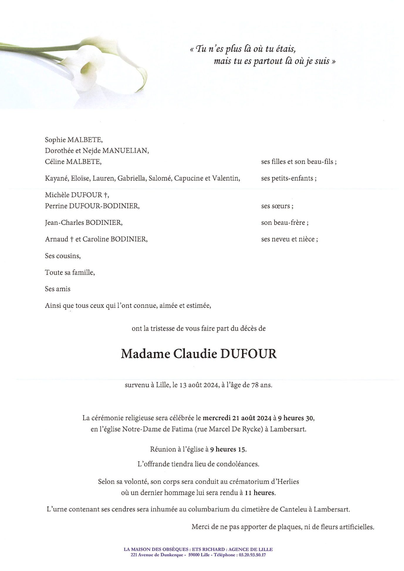 Cet espace « condoléances » est dédié à la mémoire de Madame Claudie née DUFOUR.