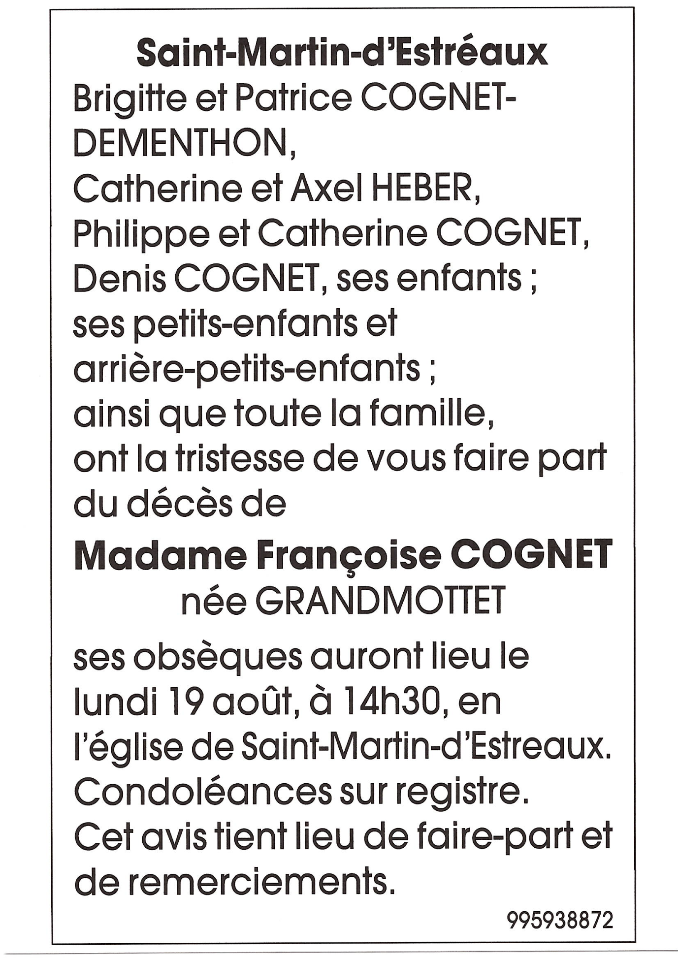 Cet espace « condoléances » est dédié à la mémoire de Madame Françoise COGNET née GRANDMOTTET.