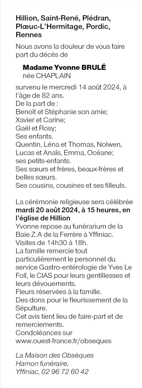 de Madame Yvonne BRULÉ née CHAPLAIN