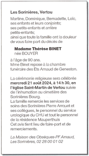 Cet espace « condoléances » est dédié à la mémoire de Madame Thérèse BINET née BOUYER.