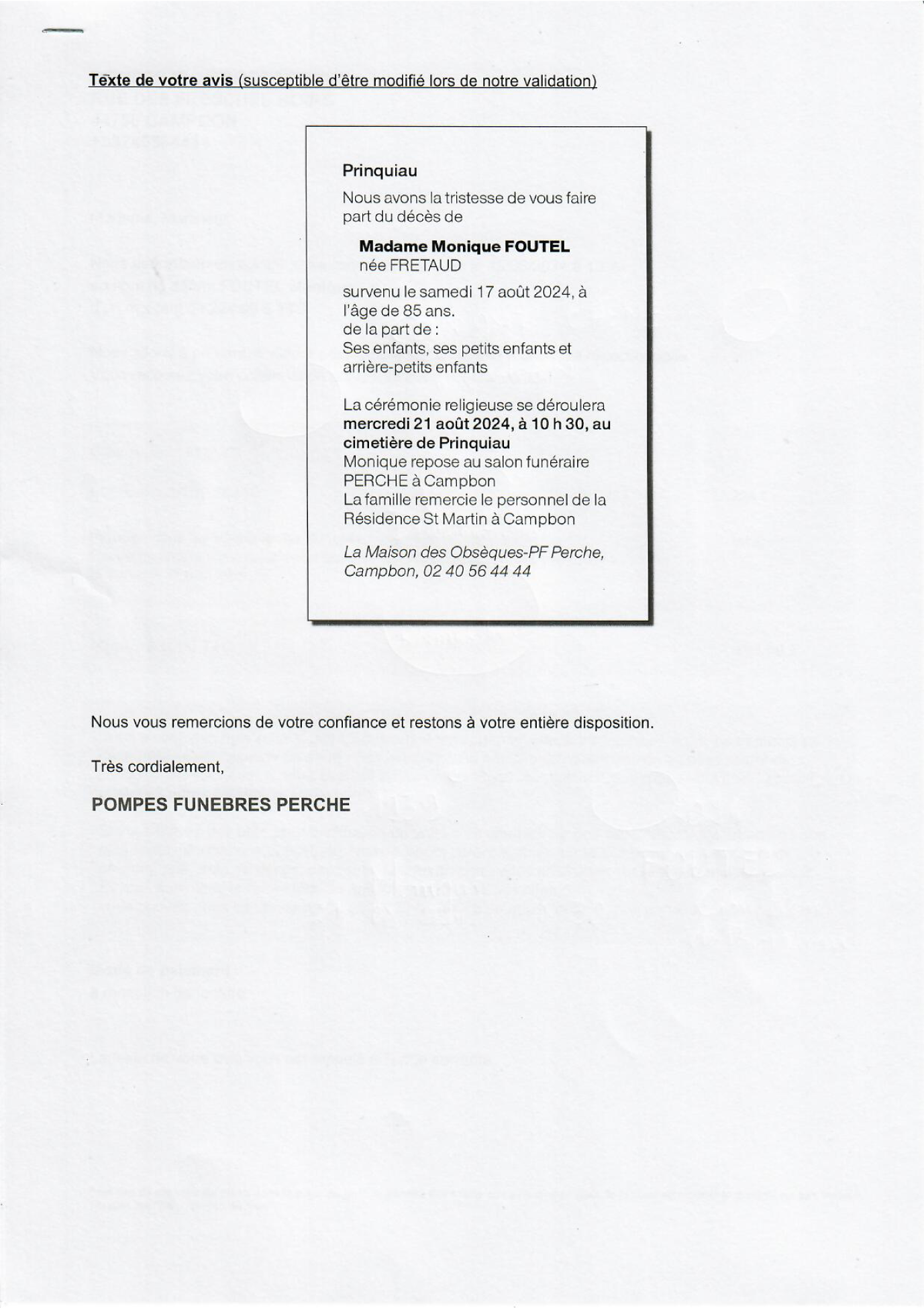 Cet espace « condoléances » est dédié à la mémoire de Madame Monique FOUTEL née FRETAUD.