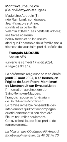 Cet espace « condoléances » est dédié à la mémoire de Monsieur François AUDOUIN.
