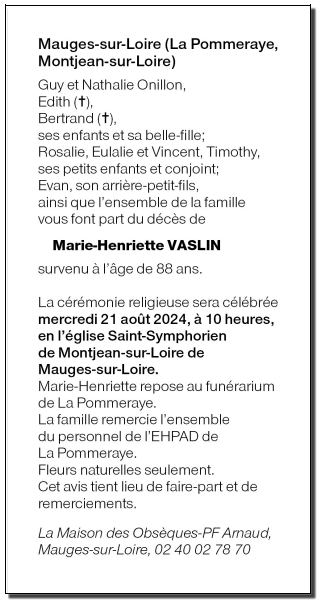 Cet espace « condoléances » est dédié à la mémoire de Madame Marie-Henriette VASLIN.