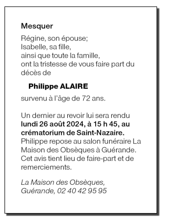 Cet espace « condoléances » est dédié à la mémoire de Monsieur Philippe ALAIRE.