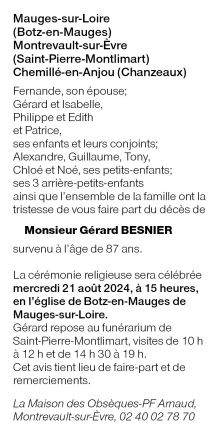 Cet espace « condoléances » est dédié à la mémoire de Monsieur Gérard BESNIER.