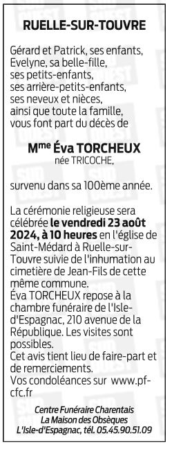 Cet espace « condoléances » est dédié à la mémoire de Madame Éva TORCHEUX née TRICOCHE.