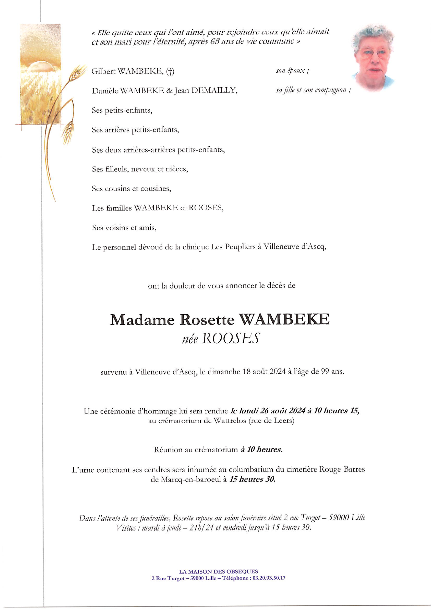 de Madame Rosette WAMBEKE née ROOSES