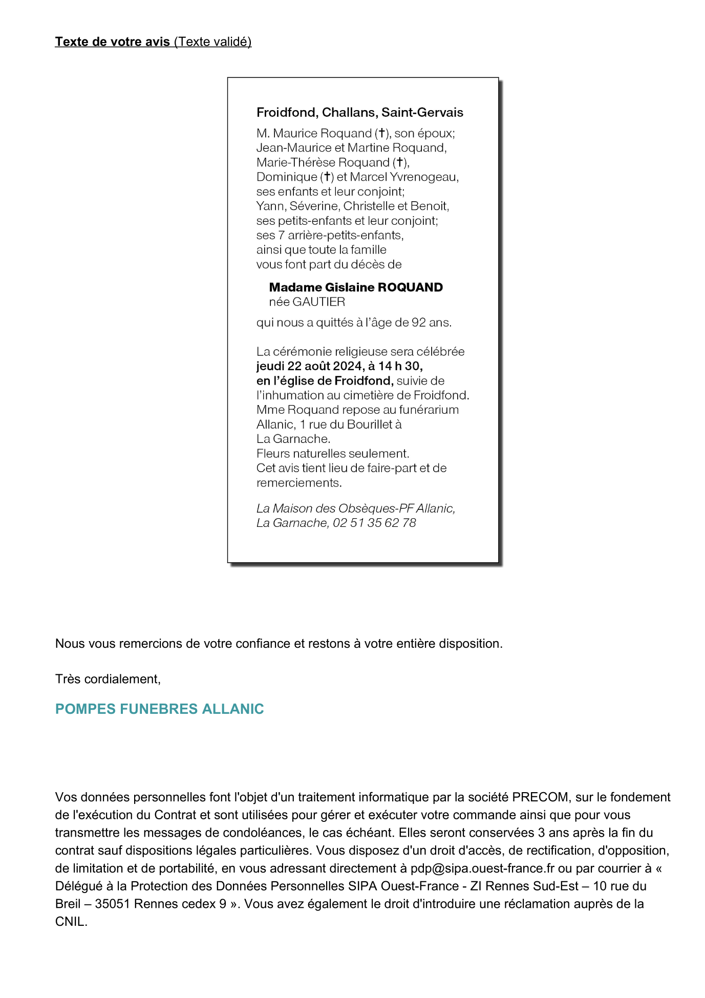 Cet espace « condoléances » est dédié à la mémoire de Madame Gislaine ROQUAND née GAUTIER.