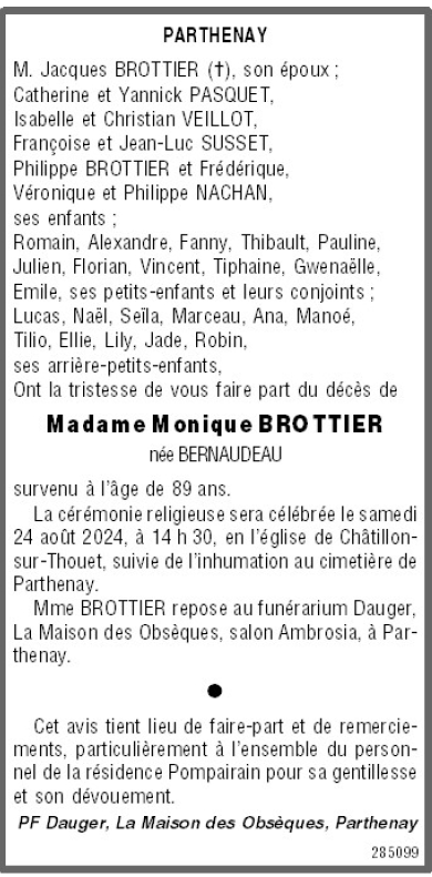 Cet espace « condoléances » est dédié à la mémoire de Madame Monique BROTTIER née BERNAUDEAU.