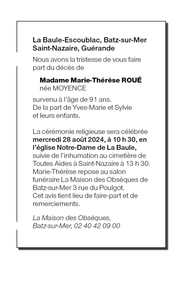 Décédée à La Baule-Escoublac (44500) le mercredi 21 août 2024