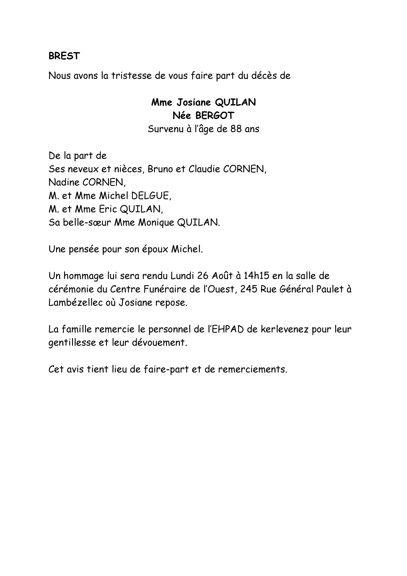 de Madame Josiane QUILAN née BERGOT
