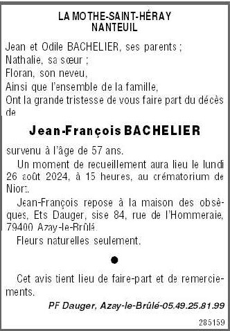 Cet espace « condoléances » est dédié à la mémoire de Monsieur Jean-François BACHELIER.