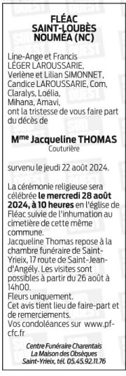 Cet espace « condoléances » est dédié à la mémoire de Madame Jacqueline THOMAS.