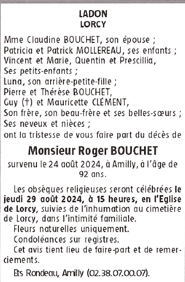 Cet espace « condoléances » est dédié à la mémoire de Monsieur Roger BOUCHET.
