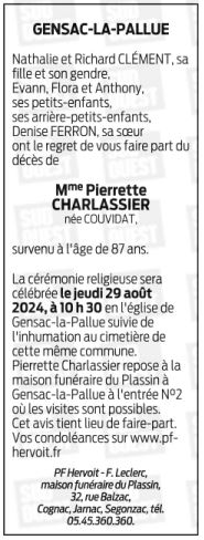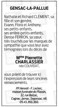 Cet espace « condoléances » est dédié à la mémoire de Madame Elina CHARLASSIER née COUVIDAT.