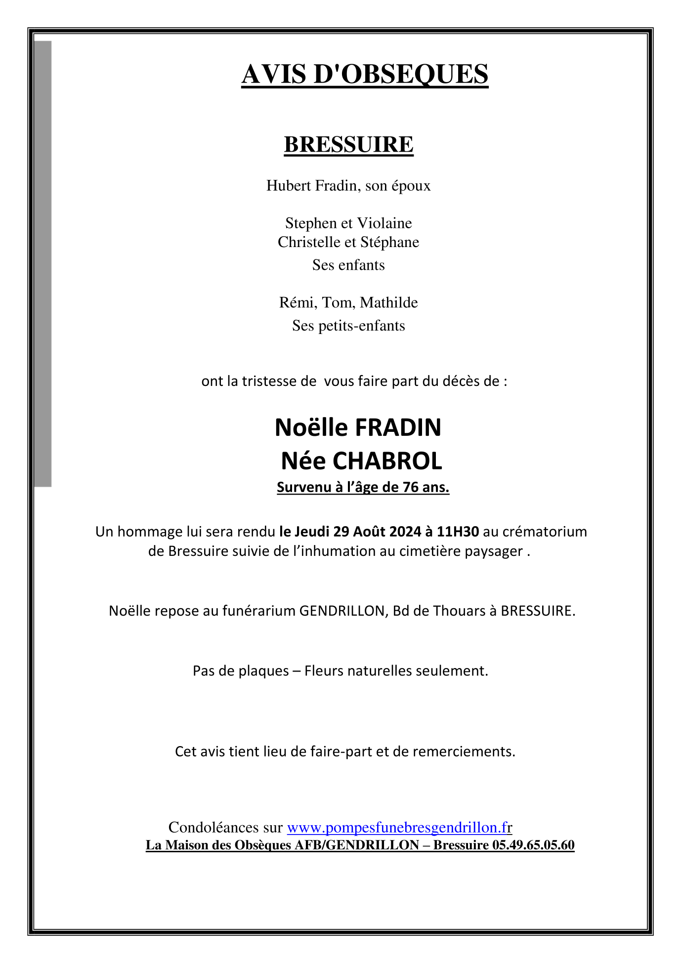Cet espace « condoléances » est dédié à la mémoire de Madame Noëlle FRADIN née CHABROL.