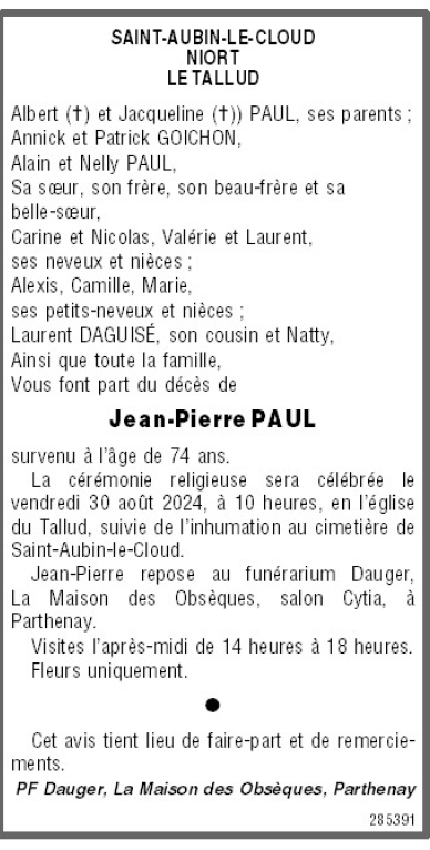 Cet espace « condoléances » est dédié à la mémoire de Monsieur Jean-Pierre PAUL.