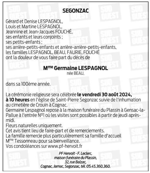 Cet espace « condoléances » est dédié à la mémoire de Madame Germaine LESPAGNOL née BEAU.