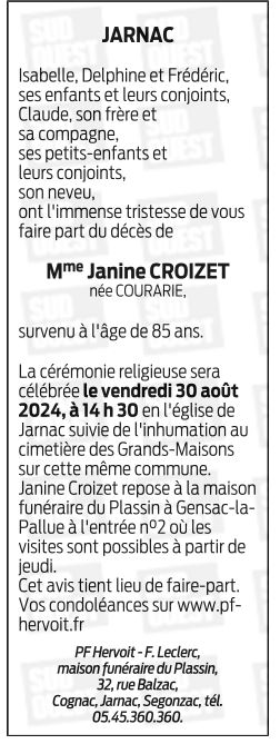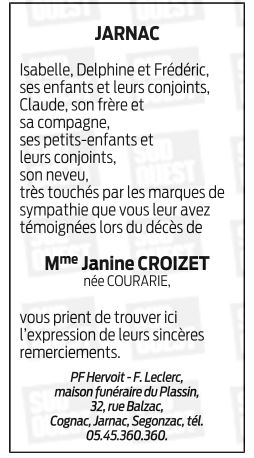 Cet espace « condoléances » est dédié à la mémoire de Madame Janine CROIZET née COURARIE.