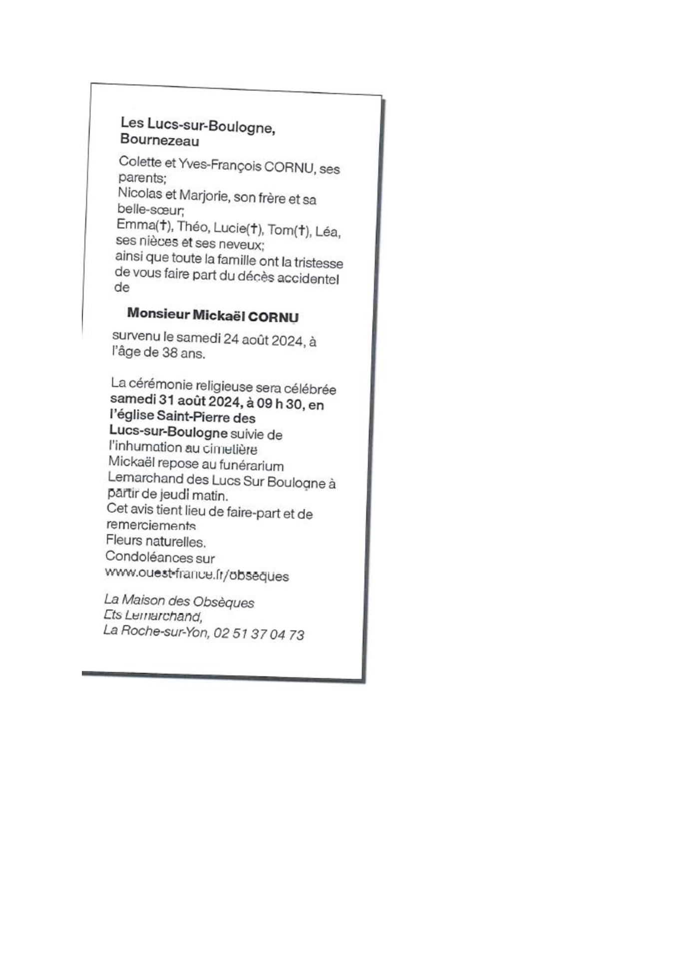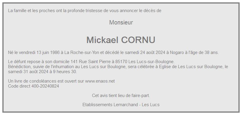 Cet espace « condoléances » est dédié à la mémoire de Monsieur Mickael CORNU.