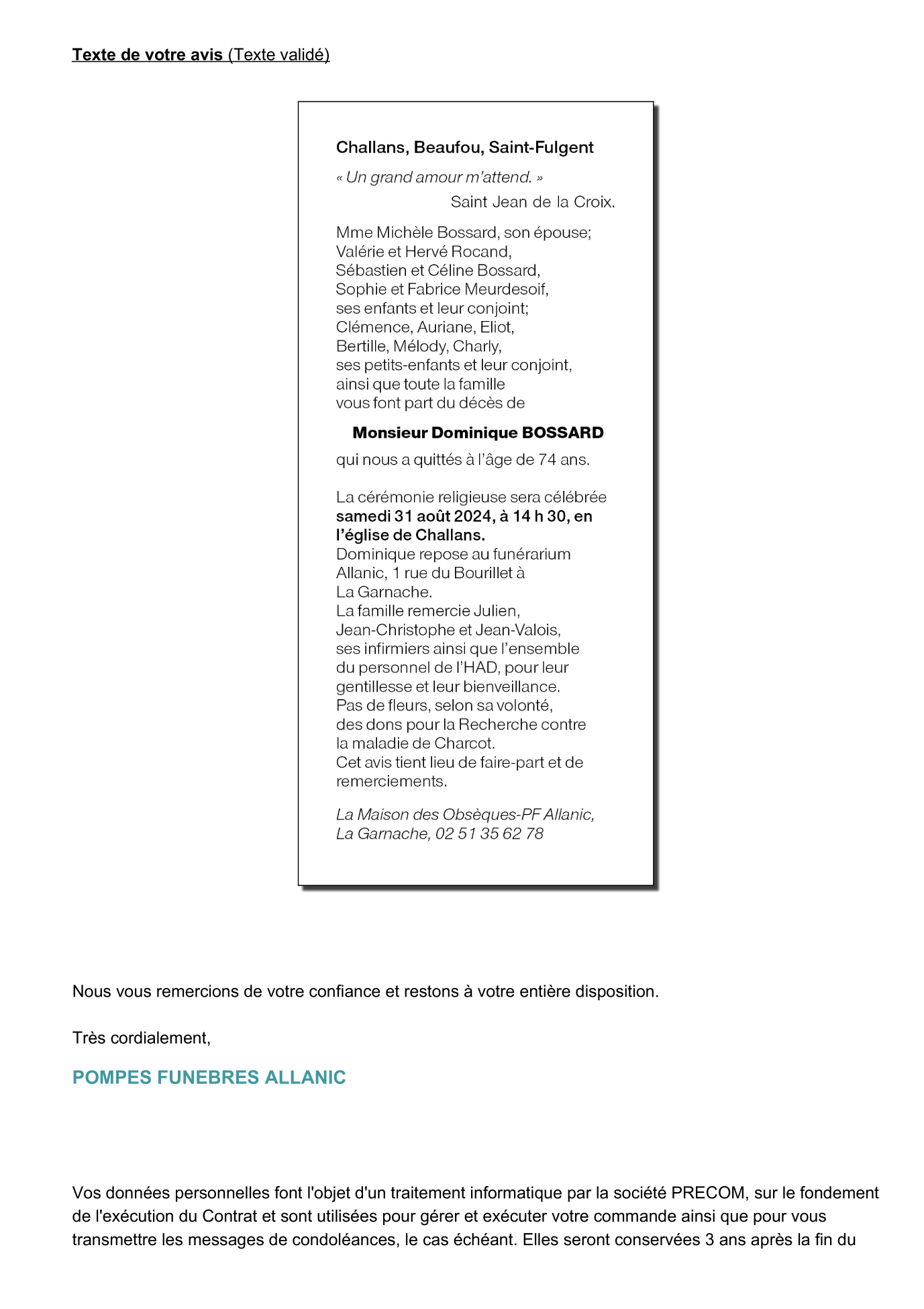 Cet espace « condoléances » est dédié à la mémoire de Monsieur Dominique BOSSARD née BOSSARD.