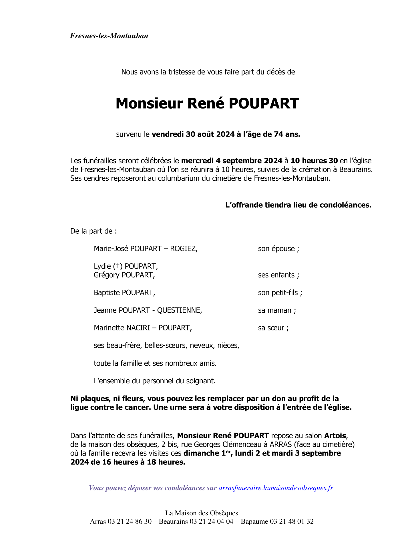 Cet espace « condoléances » est dédié à la mémoire de Monsieur René POUPART.