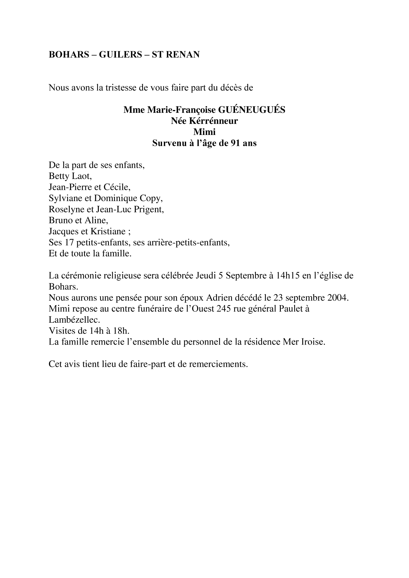 de Madame Marie Françoise GUÉNEUGUÉS née KÉRRÉNEUR