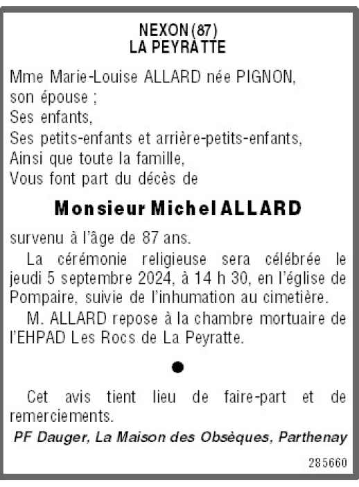 Cet espace « condoléances » est dédié à la mémoire de Monsieur Michel ALLARD.