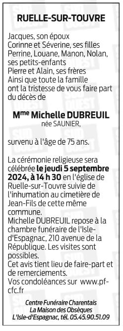 Cet espace « condoléances » est dédié à la mémoire de Madame Michelle DUBREUIL née SAUNIER.