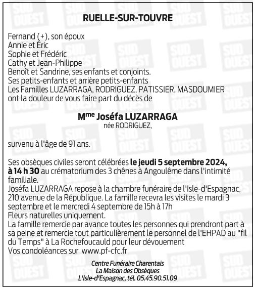 Cet espace « condoléances » est dédié à la mémoire de Madame Joséfa LUZARRAGA née RODRIGUEZ.