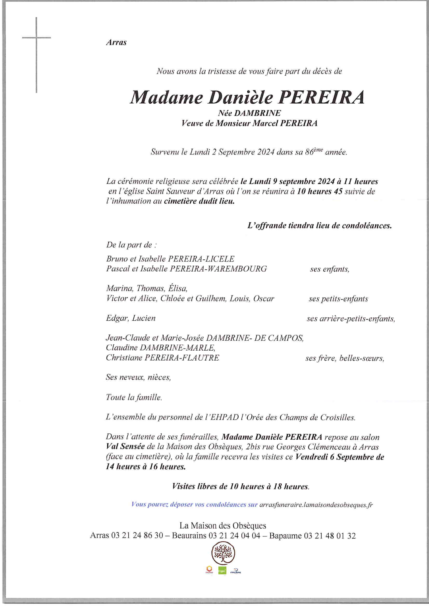 Cet espace « condoléances » est dédié à la mémoire de Madame Danièle PEREIRA née DAMBRINE.