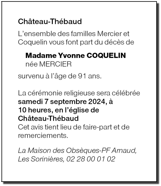 Cet espace « condoléances » est dédié à la mémoire de Madame Yvonne COQUELIN née MERCIER.