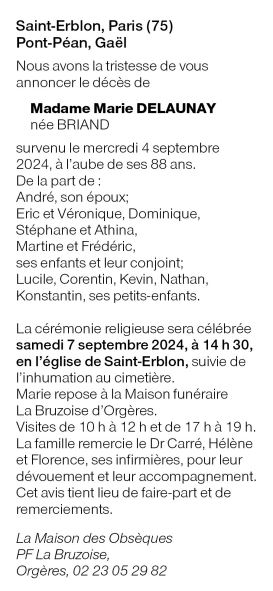 Cet espace « condoléances » est dédié à la mémoire de Madame Marie DELAUNAY née BRIAND.