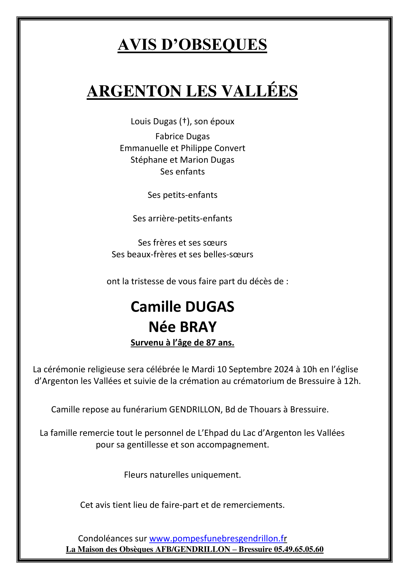Cet espace « condoléances » est dédié à la mémoire de Madame Camille DUGAS née BRAY.