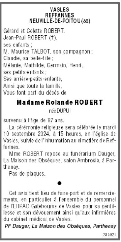 Cet espace « condoléances » est dédié à la mémoire de Madame Rolande ROBERT née DUPUI.