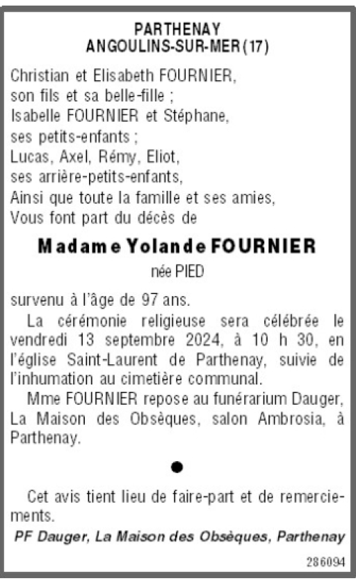 de Madame Yolande FOURNIER née PIED